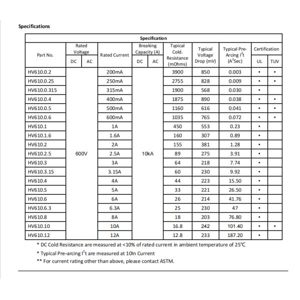 Model Number : 600VAC/DC, 6x30mm, Fast Acting, Ceramic Tube Fuses HV610 Series, For Digital Measuring Instruments